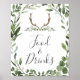 Dê aos seus hóspedes uma direção encantadora com a nossa comida de veados de madeira e o sinal de bebidas, com cor d'água verde eucalipto garland e uma elegante letra de estilo manuscrito.