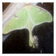A luna moth is captured resting with its wings fully open. The vibrant green wings contrast against a dark background.