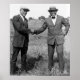 Tut Jackson (à esquerda) e Jack Johnson apertando as mãos. Resumo da LOC: Concorrentes para o "campeonato mundial de peso pesado de boxe colorida" encontram-se em Ohio antes de se prepararem. Fotografia tirada em 1922.