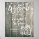 Modelos de Placas de Boas-Vindas para Recepção de Casamento - Jarro de Pedreiro Elegante e Luzes de Corda em Fundo de Madeira Rústica.