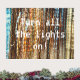 Fotografia de longa exposição com luzes amarelas e laranja dançantes sobre fundo castanho escuro. Acessório residencial de estilo Vintage e presente de na moda para qualquer ocasião. Pode substituir o texto ("Ligar todas as luzes") pela sua própria mensagem. Para mais modificações (estilo de fonte, cor de fonte, posição de texto), clique em "Editar design".