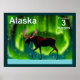 Uma imagem de um alce que caminhava sobre a neve azulada de uma noite escura de inverno e se silenciava contra o brilho verde das Luzes do Norte. Os textos "Alaska" e "Postage 3 Nuggets" também são exibidos. Esta imagem é uma em uma série de selos postais de um mito Alasca independente.