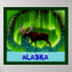 Uma imagem de um alce silenciada contra as luzes do Norte, um pouco estilizada. A palavra "Alaska" aparece no fundo numa fonte sugestiva de gelo e neve.