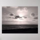Imagem serena a preto e branco do pôr do sol sobre a costa