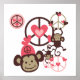 Sinais de paz em castanho rosa e chocolate, corações e macacos pequenos, um vestindo um boné rosa sobre T-shirts de macacos da Paz, ímãs, cartões, autocolantes, mousépias, bolsas, botões, guardas, travesseiros, relógios de parede, e muito mais!