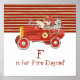 PALETA DE CORES: vermelho, branco, bege e marrom COLEÇÃO DE DESENHOS: Um delicioso pôster para enquadrar como arte de parede para decoração de quarto de bebê. Possui o texto "F é de Fire Engine (Caminhão de Bombeiros)". Uma doce coleção de arte para bebês baseada em macacos de meia retrô, mas pintada à mão em aquarela por Audrey Jeanne Roberts. Este pequeno macaco com olhos de botão e cachecol listrado vermelho e branco soprando ao vento está correndo com seu carrinho de pedal de caminhão de bombeiros retrô com um cachorrinho dálmata na parte de trás. Há um conjunto completo de convite e roupas para chá de bebê com este design. Procure por "Retro Sock Monkey (Macaco de Meia Retrô)" em nossa loja para encontrá-lo. Também podemos criar itens por solicitação