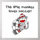 Texto de estilo infantil que diz "Este macaquinho ama futebol!" em t-shirts de macacos-meias, fato físico, canecas, cartões, autocolantes, ímanes e muito mais.