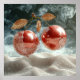 Duas maçãs brilhantes, vermelhas, suspensas em ar de médio, conectadas por um tronco fino. Cada maçã é parcialmente submersa em água limpa, com gotículas e bolhas captando a luz lindamente. As maçãs são enfeitadas com folhas delicadas e metálicas que acrescentam um toque de elegância. No fundo, um gradiente macio e enfumaçado complementa a cena, enquanto a superfície abaixo se assemelha a um terreno liso e arenoso, espumante com umidade. A composição geral transmite uma sensação de frescura e beleza artística.