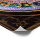 Elegante clássico, vibrante Renascentista arte fina, obra-prima de Bottega della Robbia ( Florence - Itália ) em cores brancas, azuis, verdes, castanhas.Uma cena de natividade antiga, estável, animais, árvores, cerejas aladas no céu azul sobre uma coroa floral decorativa verde e amarela brilhante.