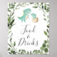 Dê aos seus hóspedes uma direção encantadora com nossa comida de dinossauros de mamãe e placa de bebidas, com cor d'água verde eucalipto garland e uma elegante fonte de estilo manuscrito.
