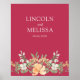 O poster de casal de casamento bonito, moderno e simples apresenta spray floral de fundo com flores brancas e cor de pêssego de cor aquosa e folhas verdes sortidas e eucalipto em fundo Viva Magenta. Personalizar o nome do casal e a data do casamento em fontes brancas modernas