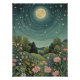 Esta ilustração encantadora captura uma cena noturna mágica num prado florescente. Um cheio, lua luminosa e uma aspersão de estrelas ouros, incluindo uma lua crescente, iluminam uma espiral, texturizada e o céu azul escuro. O primeiro plano é um campo vibrante de flores silvestres em tons de rosa, amarelo, azul e branco, com relva verde e colinas rolantes atrás delas. No meio do chão, uma floresta serena de árvores com copas grossas e verdes se estende através da paisagem, silhuetada contra o céu estrelado. O sentimento geral é de paz e maravilha, como uma paisagem de sonho de um conto de fadas.