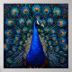 Magnífico pavão, exibindo proeminentemente sua plumagem vibrante. O corpo do pavão é de um azul profundo e rico, e tem um pescoço longo e elegante que leva a uma cabeça graciosamente arqueada. Suas penas são intricadamente detalhadas, com uma variedade de tons iridescentes de azul e verde, acentuados por padrões impressionantes semelhantes a olhos em tons de dourado e laranja. O fundo é escuro, o que realça o brilho e a vividez das penas do pavão, criando um contraste visual deslumbrante. A composição geral transmite uma sensação de beleza e elegância, capturando o encanto dessa ave icônica.