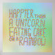 Um slogan em escrevendo colorido sobre um fundo de cores diferentes, diz o slogan: Mais Feliz Que Um Bolo De Comer De Unicórnio Num Arco-Íris.