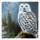 Ai gerou uma foto de uma coruja de neve sentada em uma rocha. Árvores verdes no fundo, assim como um céu de ovelha e cinza com nuvens.