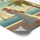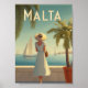 This charming vintage poster features a stylish woman in a classic 1950s dress strolling along a sunny promenade in Malta. Behind her, the Mediterranean sparkles and traditional Maltese architecture lines the waterfront. Soft retro textures and warm tones evoke the timeless elegance of mid-century coastal life on the island. A perfect piece for fans of vintage fashion, seaside charm, and nostalgic European travel art.