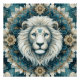 Esta é uma trabalho de arte impressionante que mostra um rosto estilizado de leão no seu centro. O homem do leão forma uma design, como uma mandala, com linhas brancas e cinzas que fluem criando um senso de movimento e textura. Ao redor da face estão padrões intrincados que amarram para fora, incluindo formas florais e geométricas em tons de azul, lacre e bege. Estes elementos contribuem para um sentido de profundidade e simetria. O fundo é um fundo profundo, pontilhado com minúsculos speck tipo estrela, dando à peça uma vibração celeste e mística. A trabalho de arte combina temas naturais e fantásticos sem parar, criando uma composição visualmente cativante.