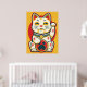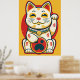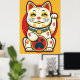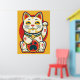 Esta ilustração vibrante apresenta um tradicional Maneki Neko japonês, ou "Gato Sortudo", representado num estilo charmoso e caprichoso. O gato é mostrado sentado em pé, erguendo sua pata esquerda em um gesto acolhedor que acredita-se trazer boa sorte e felicidade. O gato tem uma expressão deliciosa e alegre, com seus olhos largos e sua boca curvados em um sorriso suave. O Maneki Neko é predominantemente branco com manchas amarelas e vermelhas, acrescentando um toque vivo e colorido à design. Veste uma coleira verde enfeitada com um sino de ouro, simbolizando a riqueza e a prosperidade. O gato segura uma moeda vermelha grande com estampas pretas, enfatizando ainda mais seu papel de causador de sorte e de boa sorte. O fundo apresenta um círculo vermelho arrojado, melhorando a aparência brilhante e alegre do gato. O design global tem uma textura retrorreflectora, ligeiramente angustiada, dando-lhe uma sensação nostálgica e eterno.