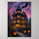 Mergulhe no espírito do Dia das Bruxas com esta poster cativante mostrando um trabalho de arte digital de uma mansão assustadora transformada para a ocasião. A mansão expele um charme estranho, enrolado em decorações de Halloween. Os morcegos saciosos levam para o céu noturno, lançando um feitiço encantador. Uma abóbora entalhada na frente adiciona um toque extra de mística. Mergulhe no ambiente de Halloween com essa obra-prima arrepiante.