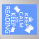 Este é o clássico poster de guerra "Mantenha calma e continue" reformulado para "Mantenha calma e continue lendo". Está escrito em branco sobre fundo colorido e é acompanhado pelas silhuetas de três livros em queda. Disponíveis em uma grande variedade de produtos, incluindo cadernos de notas, adesivos, botões, bolsas de livros e t-shirts, eles fazem presentes/presentes/tratas de excelentes para amantes de livros, escritores, leitores ou bibliotecários. As cartas, ou presentes menores, são perfeitas para acompanhar fichas de livros. Todas as cores de fundo são facilmente personalizadas para suas preferências.
