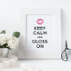 Nossa visão sobre o slogan clássico da Segunda Guerra Mundial para a beleza e maquiagem que os amantes apresentam "mantenha a calma e o brilho", tocado por uma vibrante ilustração de beijo de lábio cor-de-rosa, para uma adição bonita ao seu banheiro ou vaidade.