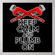 Humor no encanador com o meme da Internet "mantenha calma". Caixas de canalização cruzadas e o slogan "Mantenha calma e caçar"