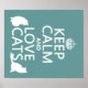 Este é o clássico poster de guerra "Manter Calmo e Continuar", reformulado para "Manter os Gatos Calmos e de Amor". Está escrito em branco sobre fundo colorido, e é acompanhado por silhuetas de gatos sentados perto das palavras. Disponíveis em uma grande variedade de produtos, incluindo cadernos de anotações, adesivos, botões, bolsas de livros e t-shirts, eles fazem presentes/presentes/guloseimas de excelentes para amantes e donos de gatos, ou obrigados que você oferece para veteranos e donos de lojas. Todas as cores de fundo são facilmente personalizadas para suas preferências.