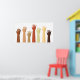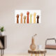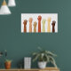 Ilustração de um grupo de mãos diversas de diferentes culturas e nacionalidades erguidas no ar. Design conceitual mostrando pessoas se juntando e dando ajuda e suporte uns aos outros. Imagem disponível em vários presentes e produtos.