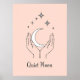 Duas mãos gentis berram uma lua crescente sob uma cobertura de estrelas, simbolizando serenidade, proteção e conexão espiritual. Colocada contra um fundo cor-de-rosa suave, essa impressão minimalista traz calma e charme celeste para qualquer espaço.