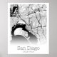 O gráfico preto e branco moderno mostra o mapa-contorno de San Diego, layout da CA com ruas, estradas e corpos de água importantes.