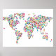 Um mapa do mundo feito de silhuetas coloridas de gatos em fundo branco.