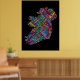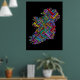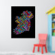 Um mapa de texto de tipografia da Irlanda com mais de 590 cidades na Irlanda. Texto multicolorido sobre fundo preto.