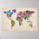 Um mapa de texto tipográfico do mundo em estilo aquoso urbano. Cada país é representado pelo seu nome, que é moldado para ajustado na área geograficamente correta. Praticamente todos os países estão representados esperam algumas das ilhas mais pequenas do Pacífico e Caribe.