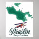 Belo mapa das Seicheles de Praslin, decorado com um velho e clássico bi-avião vermelho.