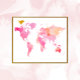 Poster do Mapa do Mundo Rosa e Dourado com um mapa do Mundo em aquarelas cor-de-rosa e uma ave de ouro fofa. Perfeito para a menina que ama viagem ao Mundo e fazer dela sua ostra.