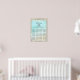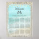 Este gráfico de assentos de poster da praia apresenta pinguins bonitos, um lindo fundo de praia aqua enquadrado com madeira rusticada e luzes de cordas no topo.