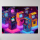 Um grupo de máquinas de fliperama vintage fica iluminado por luzes de néon vibrantes. A cena é colocada contra um pano de fundo de uma galáxia estrelada, criando uma atmosfera nostálgica, mas futurista.