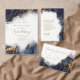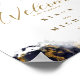 Um fundo abstrato que lembra o mármore em tons de azul marinho veinado com ouro reluzente é o pano de fundo para textos elegantes e layouts modernos de design nos pedaços desta bela suíte de casamento. A placa de casamento mostrada aqui apresenta o texto acima, mais o texto de 'Bem-vindo' e uma modelo para adicionar seus nomes e data de casamento. Procure ID644 para ver todas as peças de coordenação neste conjunto.