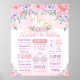 Cartaz feminino rosa, roxo e dourado do 1º aniversário com flores elegantes de aquarela e uma linda princesa cisne