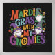 O design apresenta o trocadilho brincalhão, "Mardi Gras com as minhas GNOMIES." O texto é uma mistura de fontes arrojadas, desagradáveis e cores vibrantes, com as palavras "Mardi Gras" e "GNOMIES" nas tradicionais cores Mardi Gras, roxo, verde e ouro. Três adoráveis gnomos do estilo cartoon são os personagens centrais. Todos eles estão vestindo chapéus pontiagudos e comemorando com colares de bico, varas festivas, e outros símbolos do Mardi Gras como o pulmão-de-lis. O gráfico inteiro é colocado sobre um fundo preto, que faz as cores brilhantes pop e adiciona ao sentimento comemorativo.
