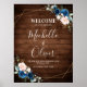 Poster de boas-vindas florais azuis-escuras azuis-marinho de-de-boas-vindas, com elegante buquê de azul-marinho, azul-real, branco, rosa de pincel verde-escadaria e folhas de eucalipto verdes-sábio elegantes e cintilação geométrica neutra com brilho nos fundos da madeira rústica. Entre em contato comigo para obter ajuda sobre a personalização ou se você precisar de outro produto com este design.