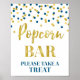 Sinal de bar de pipoca para chá de fraldas, chá de panela, festa de aniversário ou casamento em um padrão de confete azul e ouro marinho.