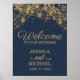 Elegante, na moda, e marinho azul chic com luzes de cordas de ouro e sinal de casamento "Bem-vindo ao nosso casamento". Personalize com os nomes da noiva e do noivo e sua data de casamento. Texto é uma bela fonte de script de caligrafia.