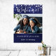 Uma poster de boas-vindas à festa de aniversário de fotográfica. Personalize e adicione um nome e uma idade. fundo azul marinho, texto branco. A cor azul é irregular. Decorado com estrelas de falso prata.