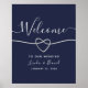 Elegante, moderno e minimalista poster de boas-vindas ao casamento azul marinho com corda prateada e simples escrita à mão.