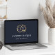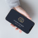 Design de logotipo elegante para estúdios de ioga, instrutores de ioga, spas ou profissionais de bem-estar apresentam uma ilustração falsa de flor de folha de ouro de lótus com uma silhueta sutil de uma pessoa meditando trabalhou na design. Personalize com duas linhas de texto personalizado em um fundo azul de marinho rico. Um design de microfone para qualquer indústria de bem-estar ou profissão holística relacionada à saúde. Este design pode ser adquirido como um download digital instantâneo para seu uso.