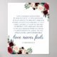 Use o nosso cartaz de marinho rústico, marsala e flor rosa "Love Nunca Fails" para decorar no seu casamento e/ou casa. O texto é completamente personalizável, pelo que se pode mudar para um verso semelhante, se preferir. Use a ferramenta "Personalizar este modelo" do Zazzle para inserir suas próprias informações. Se você precisar alterar o posicionamento das caixas de texto, a cor ou o tamanho da fonte, basta clicar no botão "Clique para personalizar mais" para alterar essas coisas. Certifique-se de verificar nossa grande seleção de itens coordenadores navegando na coleção Rustic Marinho e Marsala Floral Wedding!