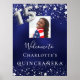 Um poster de boas-vindas para uma Quinceañera cinzenta e glamourosa, festa de aniversário 15. Um fundo azul marinho decorado com estrelas de falso prata. A cor azul é irregular. Personalize e adicione uma foto e um nome. O número 15 é escrito com uma fonte no estilo do balão.