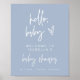 Este moderno sinal de boas-vindas do chá de fraldas apresenta uma fonte boêmica assustadora com uma combinação de cores azul e branca empoeirada para um rapaz. Seu design é o sinal perfeito para a mãe moderna.
