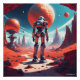 Um astronauta solitário está sobre uma paisagem de alienígena rochosa, mirando em uma enorme estrutura robótica com uma cúpula clara e pernas mecânicas. Vários planetas são visíveis no céu, criando uma cena marcante de exploração espacial.